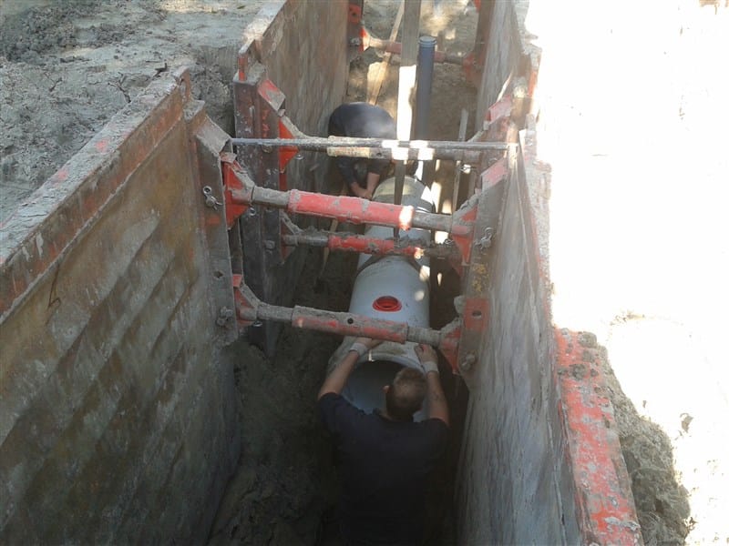 update 28/9. Door de bijzonder diepe ligging van de riolering en de hoge grondwaterstand, zijn we genoodzaakt sleufbekisting toe te passen; zie de bijgevoegde foto’s. Ook is er extra bemaling opgezet om het opkomende grondwater te beteugelen dat door de onderbroken leemlaag werkelijk naar boven spoot.
